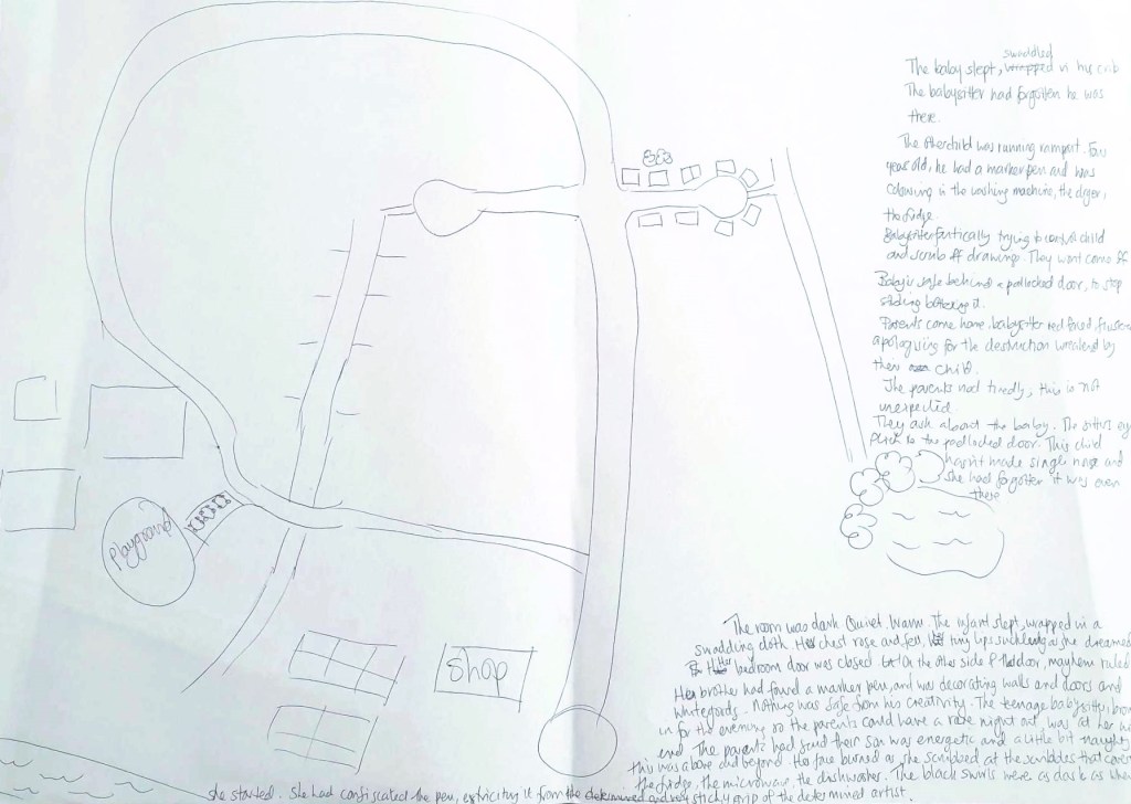 The idea was to write a plot. The facilitator explained the difference between a plot and a story. One involves timelines and sequential order, and the other answers the why. Or something like that. That part almost made sense. What threw me was the piece of paper we were given and the instructions to draw our childhood home and then expand out to our streets and larger neighbourhood. At the same time, we were to add trees and other items that we remember being along the streets or near those homes. BUT, the story wasn’t necessarily about our childhood. It could be inspired by what we thought happened on those streets or in those homes.