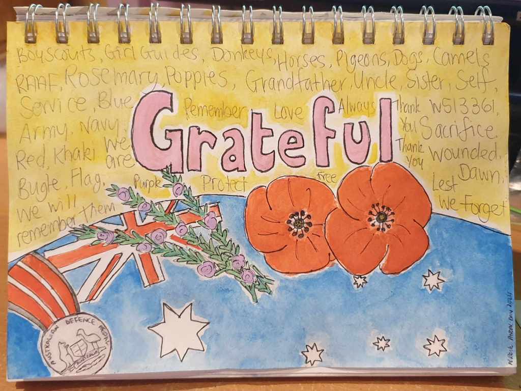 I am not a gifted artist. Nor a skilled one. That’s probably evident in the image of the artwork in this post, which I drew and painted. It depicts two poppies, some sprigs of rosemary, and a Defence Service medal on the Australian flag. The background of words connected to ANZAC Day is overwritten with the phrase ‘Grateful’ in my closest approximation of hot pink, which is what Google tells me is the colour of gratefulness.